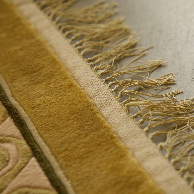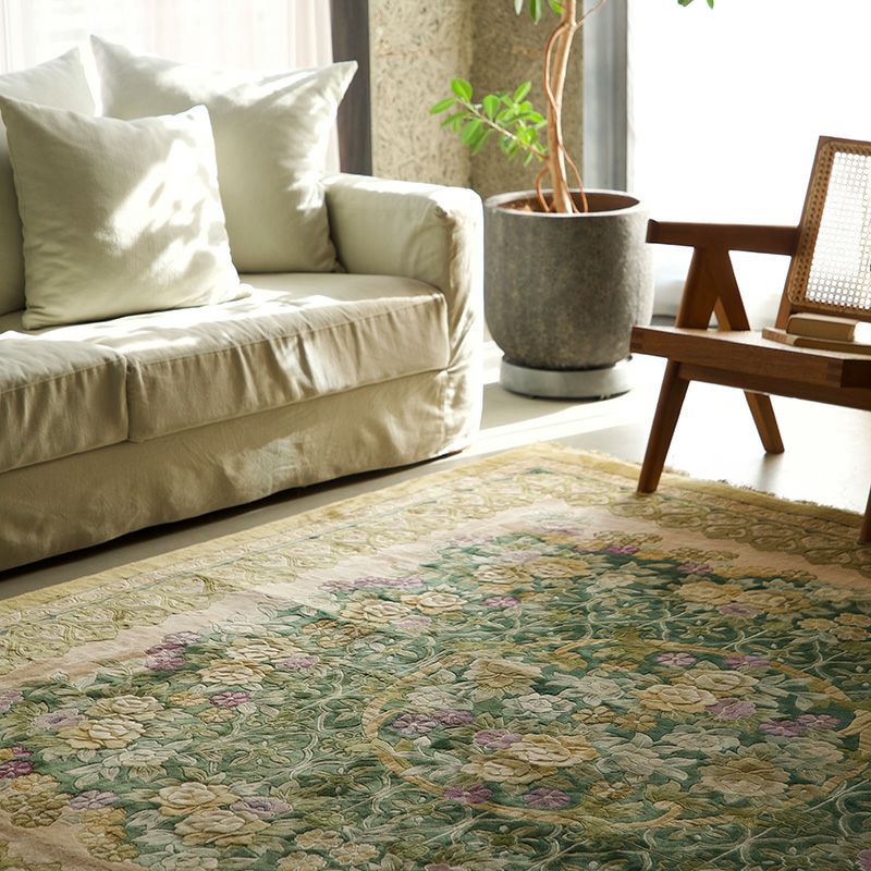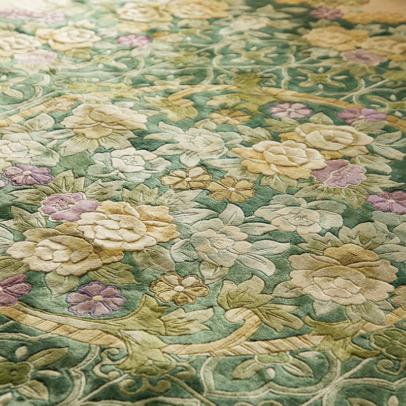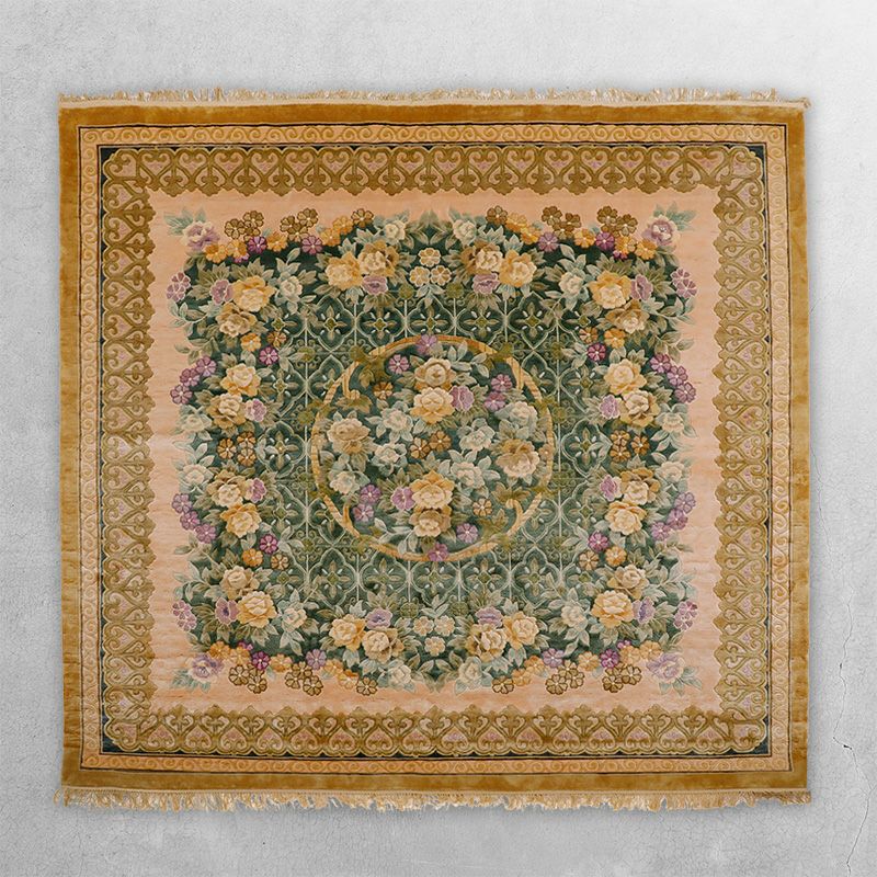 シルク緞通特融の技術で立体的に見える花柄が目をひく、古い洋館にあるアンティークのような雰囲気のあるデザインです。