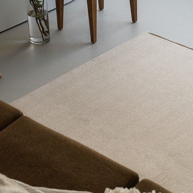 遠くから見るとフラットな無地に見えますが、ほんのりとニュアンスが感じられるのは、ヘリンボンのオリジナル柄のおかげです。ラグはシンプルにしてクッションや小物で変化をつけたいという方にはぴったりのアイテムです。