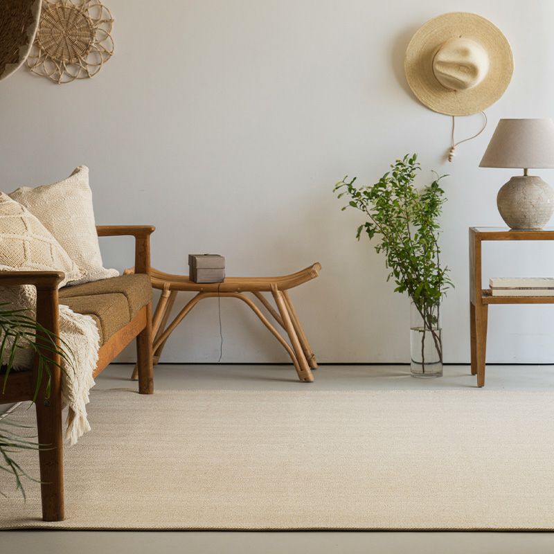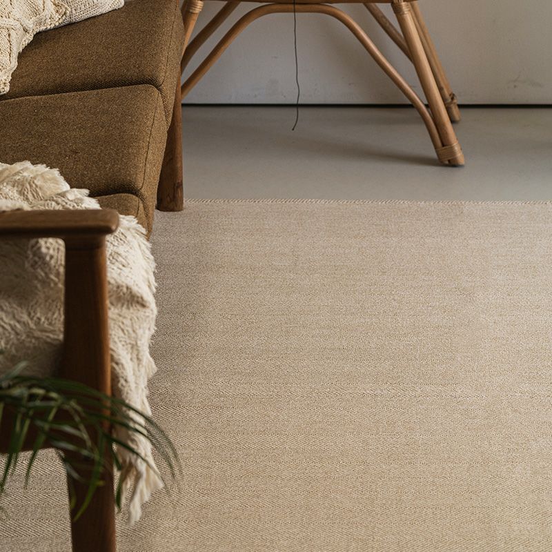 遠くから見るとフラットな無地に見えますが、ほんのりとニュアンスが感じられるのは、ヘリンボンのオリジナル柄のおかげです。ラグはシンプルにしてクッションや小物で変化をつけたいという方にはぴったりのアイテムです。